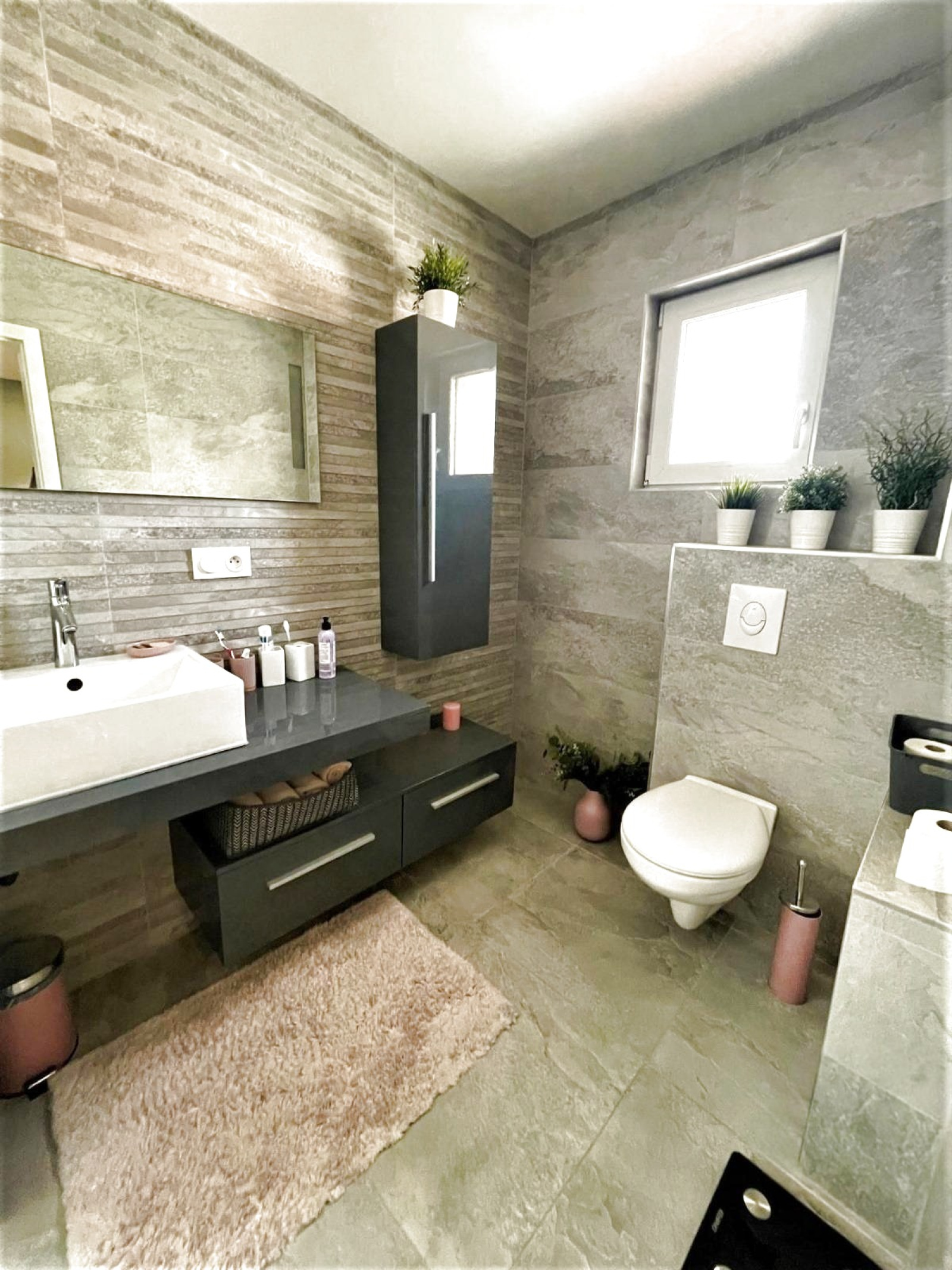 Une douche à l'italienne avec WC et fenêtre.